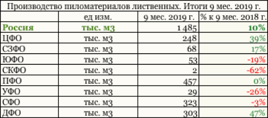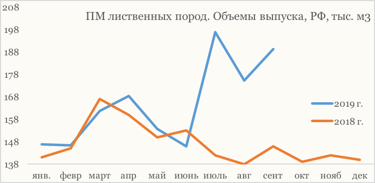 Производство лиственных пиломатериалов, РФ, 9 мес. 2019 г.
