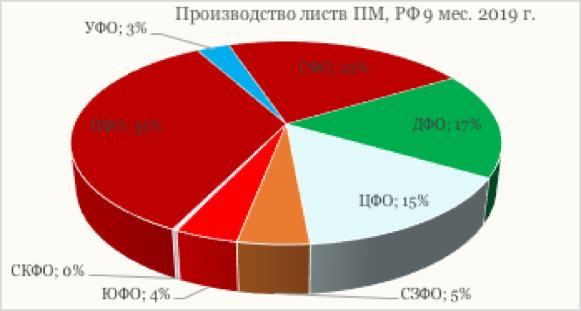По состоянию на октябрь 2019г. максимально высокие объемы выпуска лиственных пиломатериалов зафиксированы в Приволжском ФО, доля составляет 35%. На втором месте по объемам производства лиственных пиломатериалов находится Сибирский ФО с долей рынка 22%. Третье место в связи с увеличением выпуска лиственных пиломатериалов закрепилось за ДФО, доля 17%. По итогам 9-ти мес. 2019 г. ЦФО занимает долю 15% отечественного производства лиственных пиломатериалов. На долю СЗФО приходится 5% всего выпуска лиственных пиломатериалов, производимых в России в настоящее время.