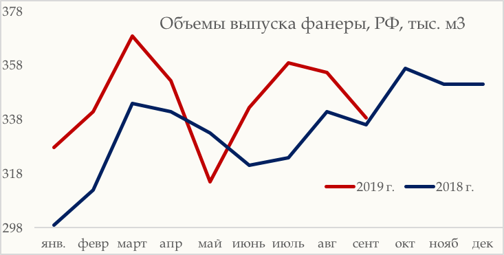 Производство фанеры в РФ, 9 мес. 2019 г.