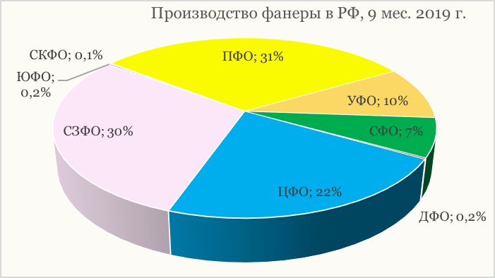 Наиболее высокие объемы выпуска фанеры по итогам 9-ти мес. 2019 г. производят два федеральных округа – Северо-Западный ФО и Приволжский ФО, доли рынка 30% и 31% соответственно. В Центральном ФО в настоящее время выпускают 22% отечественного производства фанеры. Уральский ФО по объемам выпуска фанеры занимает долю рынка 10%. Доля рынка Сибирского ФО по объемам выпуска фанеры по последним данным составляет 7%.