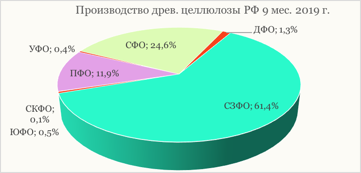 В Приволжском ФО производством целлюлозы в настоящее время заняты четыре предприятия. Доля рынка ПФО составляет 12%. За 9 мес. 2019 г. выпуск целлюлозы по варке в ПФО составил 724 тыс. тонн, что на 2№ меньше чем год назад за такой же период. Крупное предприятие этого региона - АО «Соликамскбумпром». Предприятие производит в основном ТММ и древмассу, а также сульфитную целлюлозу, совокупный с объемам выпуска древесной целлюлозы до 450 тыс. тонн. На втором месте с объемом варки древесной целлюлозы около 140 тыс. тонн выступает старейшее предприятие – Марийский ЦБК. Крупное бумаго-картонное предприятие группы ПЦБК» - «Пермский картон» производит в основном древесную массу в объеме 70 тыс. тонн. На Южный ФО по итогам 9-ти мес. 2019 г. приходится 0,5% от российского выпуска древесной целлюлозы. За этот период было выпущено около 28 тыс. тонн, что на 0,7% меньше чем год назад за такой же период. В ЮФО в Республике Адыгея расположено предприятие SFTgroup по выпуску ХТММ – «Картонтара». Доля Уральского ФО в совокупном производстве древесной целлюлозы невелика и составляет 0,4%. По итогам 9-ти мес. 2019 г. производство не превысило 23 тыс. тонн, что на 3,8% больше аналогичного периода годом ранее.В Свердловской области расположены два предприятия - ЗАОр "Туринский ЦБЗ" и Новолялинский ЦБК, Объемы варки сульфатной целлюлозы на первом ЦБК достигли 23 тыс. тонн за год, второе предприятие рассчитано на выпуск сульфатной целлюлозы в размере до 20 тыс. тонн. По состоянию на конец 3 кв. 2019 г. запланировано строительство семи новых ЦБК: • лесохимический комплекс в Енисейском районе Красноярского края, ООО «Сибирский Лес» (930 млн тонн целлюлозы в год; объем инвестиций — более 115 млрд руб.); • целлюлозный завод в Череповецком районе Вологодской области (1,33 млн тонн воздушной целлюлозы в год; запланированные инвестиции — 2,2 млрд евро); • восстановление производства целлюлозы в Енисейском районе Красноярского края, Segezha Group (предположительные инвестиции 1,5-3 млрд долл. США); • лесопромышленный комплекс в Богучанском районе Красноярского края, АО «Краслесинвест» (830 тыс. тонн целлюлозы в год); • целлюлозно-бумажный комбинат в Усть-Илимске Иркутской области, группа «Илим» (130 тыс. тонн целлюлозы в год; запланированные инвестиции — 1 млрд долл. США); • целлюлозный комбинат в Амурске Хабаровского края, компания China Paper (500 тыс. тонн сульфатной целлюлозы в год; инвестиции 1,5 млрд долл. США); • строительство Амазарского ЦБК в Могочинском районе Забайкальского края (230 тыс. тонн небеленой сульфатной целлюлозы в год). См. Инфографика