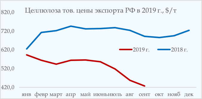 Динамику см. «Инфографика»: https://www.lesonline.ru/news/?cat_id=25&id=379378 Производство целлюлозы в России по объемам варки за последние два года выросло незначительно – в 2017 г. объёмы увеличились почти на 5%, в 2018 г. рост составил около 3%. По объемам экспорта отечественной целлюлозы значительных изменений за рассматриваемый период не отмечено – в 2018 г. уровень поставок целлюлозной массы вырос на 0,8%, в 2017 – упал на 1,6%. Важно учитывать, что экспортная целлюлоза – это так называемая товарная целлюлоза, т.е. уже максимально обезвоженная и прессованная, после чего упакована в специальные пачки для отправки. Внешнеторговые цены Основной тенденцией на экспортном рынке целлюлозы в 2019 г по ценовому параметру стало резкое удешевление российской сульфатной целлюлозы. Так, по состоянию на сентябрь 2019 г. целлюлоза из России за период с начала года подешевела на 41%. В сентябре 2019 года средние внешнеторговые цены на отечественную товарную целлюлозу (коды ТН ВЭД 4702-4704) соответствовали уровню 427,4 $/тонну.