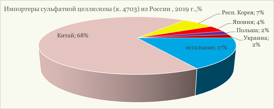 Основным импортером сульфатной целлюлозы из России, причем с большим отрывом от других стран, выступает Китай. Доля Поднебесной среди импортеров российской целлюлозы по последним данным составила 68%. Основной объем экспортных поставок сульфатной целлюлозы в КНР отправляется из Иркутской области (95%) и в первую очередь с Усть-Илимского ЦБК. Существенно меньше целлюлозы отгружается в Республику Корея (доля поставок 7%), в Японию (4%), в Польшу (2%), в Украину (2%), а также в Германию (1%) и в Бельгию и другие страны.