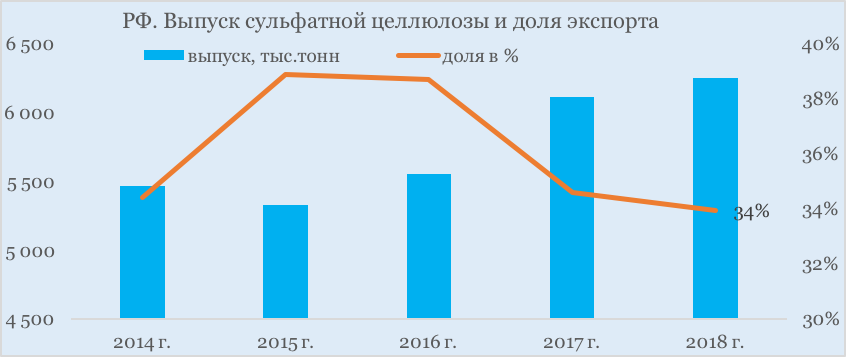 См. https://www.lesonline.ru/news/?cat_id=25&id=393479 Производство и экспорт сульфатной целлюлозы (Chemical wood pulp, Код 4703) в России. Итоги 2018 г. На мировые рынки из России поступает в основном сульфатная целлюлоза. В совокупном объеме российского экспорта на долю поставок сульфатной целлюлозы приходится 93%. В производстве древесной целлюлозы объемы варки сульфатной целлюлозы также превалируют. Так, структурно производство древесной целлюлозы в России выглядит следующим образом – 64% приходится на сульфатную целлюлозу, 25% на древесную массу и 3% на сульфитную целлюлозу. Производство сульфатной целлюлозы в большей степени ориентировано на внутренний рынок. Так, в 2018 г. производство сульфатной целлюлозы в России составило 6,25 млн. тонн, при этом на экспорт было отправлено более 2,12 млн. тонн. Таким образом, доля экспорта сульфатной целлюлозы от объема производства составила 34%. Динамика показателя "Доля экспорта от объема выпуска сульфатной целлюлозы": Одной из тенденций российского рынка целлюлозы стало увеличение выпуска сульфатной целлюлозы за последние три года. Экспорт же сульфатной целлюлозы за этот период изменился незначительно. Так в 2017 г. был отмечен спад экспорта сульфатной целлюлозы на уровне 2%, в 2018 г. поставки выросли на 0,4%. При этом объемы выпуска сульфатной целлюлозы в России за два предыдущих года выросли существенно – в 2017 г. рост составил 10%, после чего в 2018 г. еще на 2%. В результате кривая по показателю «доля экспорта в объеме выпуска» с 2016 г. резко пошла вниз.