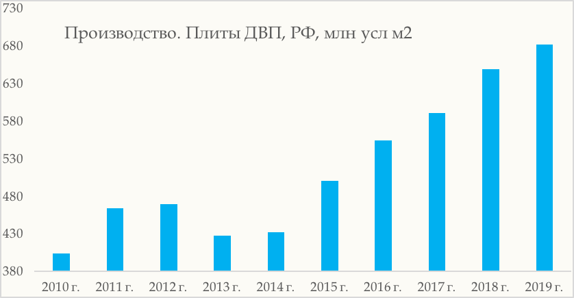 Производство древесно-волокнистых плит в России сегодня – один из быстрорастущих рынков лесной отрасли. В 2019 году выпуск древесно-волокнистых плит или других одревесневших материалов (ДВП) в целом по стране достиг уровня 682 млн. усл. м2.