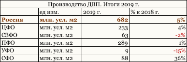 см. Инфографика - ДВП - ВЫПУСК Региональный выпуск плит ДВП в России Производство ДВП размещено практически во всех федеральных округах Российской Федерации. В соответствии с производственными показателями по объемам выпуска ДВП в 2019 г. лидирующие позиции занимает Приволжский ФО, доля рынка - 45%. На предприятия, расположенные в Центральном ФО в настоящее время приходится 24% совокупного выпуска ДВП страны. Третье место по объемам выпуска ДВП занимает Сибирский ФО с долей рынка 13%. Производители Северо-Западного ФО занимают нишу российского рынка полит ДВП в размере 9-ти пироцентов. В Уральском ФО производство плит ДВП представлено слабо, в настоящее время этом регионе выпускают всего 1% от совокупного производства плит ДВП России. Таблица. Производство ДВП в 2019 г.