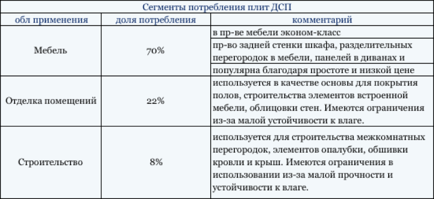 Сегменты применения плит ДСП В мебельной отрасли – 70%