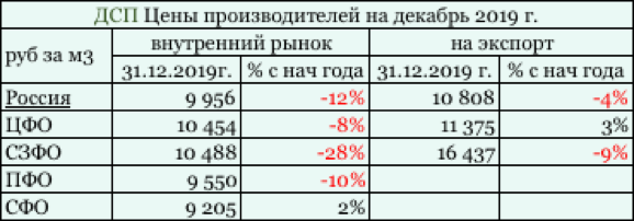 Центральный ФО. Цены производителей ДСП для реализации на внутреннем рынке на конец 2019 года соответствовали уровню 10545 руб за кубометр, с начала года ДСП подешевели на 8%. Экспортные цены на ДСП с предприятий ЦФО в декабре 2019 г. реализовывались по ценам 11375 руб за м3, что на 3% выше цен на начало года. Производители плит ДСП в Северо-Западном ФО существенно сократили цены продаж - за период с начала годаотпускные цены на ДСП упали на 28% и составили на конец года 10488 руб за м3. Снижены и экспортные цены - спад составил 9% с начала года до 16437 руб за кубометр. В Приволжском ФО цены производителей ДСП для российского потребителя в декабре 2019 г. соответствовали уровню 9550 руб за м3, с начала года цены были снижены на 10%. В Сибирском ФО производители плит ДСП для внутреннего рынка немного увеличили цены реализации, рост составил 2%, а на конец декабря 2019 г. уровень цен соответствовал 9205 руб за кубометр. Отметим, что средневзвешенные значения отпускных цен с завода не включают доставку и не учитывают НДС. Таблица. Динамика цен производителей РФ на плиты ДСП