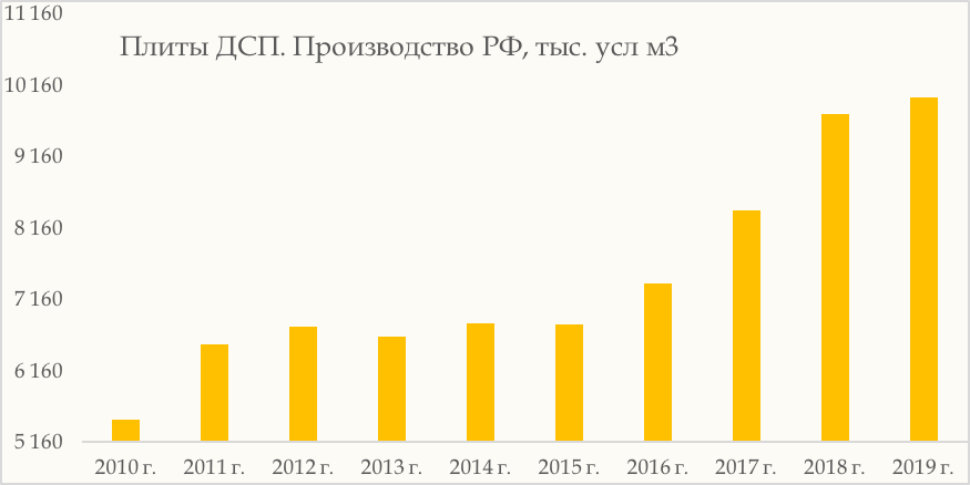 Российский рынок плит ДСП – один из динамично развивающихся рынков деревообрабатывающей отрасли страны. Четвертый год подряд рынок ДСП демонстрирует увеличение выпуска. За предыдущие два года на рынке плит ДСП был зафиксирован значительный прирост выпуска продукции. Так в 2018 году объемы выпуска плит ДСП увеличились на 16,5%, в 2017 году рост составил 15%. В 2019 г. производство плит ДСП в продолжило рост - показатели в целом по России увеличились на 2,5%.