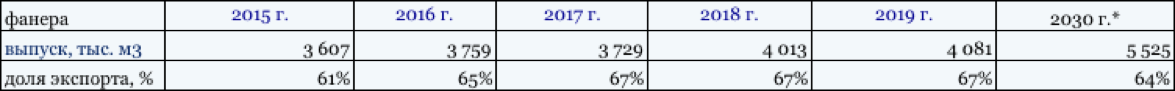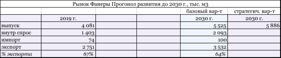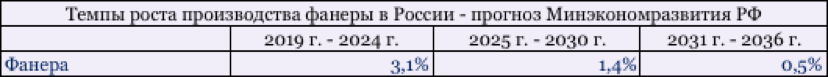 Прогнозирование российского рынка фанеры к 2030 году В соответствии с базовым прогнозом, составленным Минэкономразвития РФ, производство фанеры в целом по стране к 2030 году вырастет до 5,53 млн. м3. Согласно стратегическим планам министерства уровень выпуска фанеры за рассматриваемый период станет несколько выше и составят около 5,9 млн. м3. Объем отгруженной фанеры для внешних покупателей к 2030 году увеличится до 3,5 млн. м3. При этом внутренний спрос на фанеру к 2030 года вырастет до 2,1 млн. куб. метров. В перспективе сохнанится тенденция фанерного рынка России - большая часть фанерной продукции будет отгружаться внешнеторговым партнерам. Однако эксперты полагают, что к 2030 году увеличится и внутренний спрос на фанеру. Доля экспорта от объема производства фанеры будет соответствовать значению - 64%. Темпы роста выпуска фанеры в России до 2036 г. В соответствии с расчетами Минэкономразвития РФ, среднегодовые темпы роста производства фанеры за период с 2019 г. по 2024 г. составят в среднем по стране 3,1%. Следующие пять лет данный показатель по объемам выпуска фанеры будет существенно снижен и не превысит 1,4%, после чего темпы роста российского производства фанеры вновь упадут – за период с 2031 г. по 2036 г. среднегодовые темпы роста производства фанеры в России в соответствии с прогнозом составят всего 0,5% ежегодно. Таблица. Среднегодовые темпы роста производства фанеры в России. Расчеты Минэкономразвития РФ