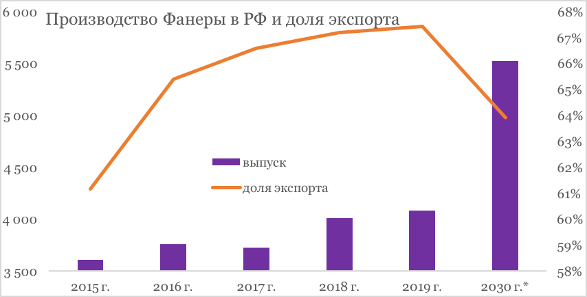 Развитие производства фанеры (в основном березовой) в России будет направлено на удовлетворение внутреннего и экспортного спроса. К 2030 году дополнительное производство фанеры в России в сравнении с уровнем современного рынка составит полтора млн. кубометров, в том числе свыше миллиона кубометров на заявленных к строительству мощностях. Экспорт фанеры Современное отечественное производство фанеры в большей степени ориентировано на экспорт. Доля экспортных поставок фанеры от объема выпуска в 2019 году составила 67,4%, на мировые рынки в этот год было отгружено около 2751 тыс. м3 фанеры, что на 2,5% больше, нежели год назад. Согласно базовому прогнозу объем экспорта фанеры к 2030 году увеличится на треть – поставки российской фанеры на внешние рынки вырастут до 3532 тыс. м3. Показатель «доля экспорта фанеры от уровня производства» к 2030 году упадет до значений 64%, что будет обусловлено ростом внутреннего рынка. Диаграмма. Динамика производств фанеры в РФ до 2030 г. и доли экспорта