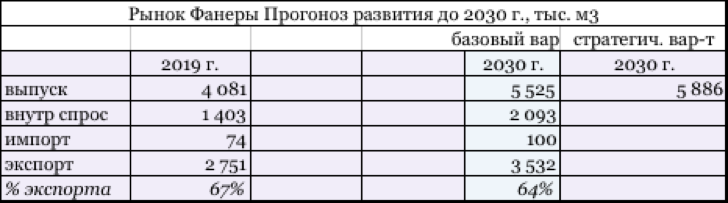 Доля экспорта фанеры в объеме выпуска. В 2019 г. доля экспорта российской фанеры от объема выпуска составила 67,4%. Характеризуя динамику экспортной доли фанеры обратим внимание на рост данного показателя за последние пять лет. Так, например, в 2013 г. доля экспорта составила 53%. В 2018 г. этот показатель уже достиг уровня 67%, в 2019 г. показатель «доля экспорта» вырос ещё на 0,7 п., обновив рекордное значение. Сегодня частично освободившуюся нишу фанерной продукции заполняют более дешевые плиты OSB, производство которых последние пять лет стремительно растет. Интересно отметить, что в 2017 г. объем потребления OSB в России впервые вышел на один уровень с потреблением фанеры. Таким образом, ещё одной из тенденций рынка фанеры следует назвать замещение фанеры низких сортов в сегменте малоэтажного строительства: в кровле, ограждающих конструкциях, обшивке стен и потолков, временных строениях. Важно также учитывать, что последние пять лет российский потребительский спрос на древесные плиты формируется также за счет плит OSB. Производство данного вида плит активно развивается, вводятся в строй новые предприятия, стремительно растут темпы производства. Замещение фанеры на плиты OSB на внутреннем рынке усиливает конкуренцию. Логичным выходом для многих отечественных производителей фанеры стало увеличение экспортных поставок. Баланс производства и потребления фанеры и OSB напрямую зависит от состояния российской экономики и макроэкономических факторов, влияющих на основной сегмент потребления — строительство. Согласно стратегии Минэкономразвития, развитие производства как хвойной, так и березовой фанеры в России будет направлено на удовлетворение и внутреннего и экспортного спроса. Одной из важных тенденций фанерного рынка страны, пожалуй, можно назвать рост внутреннего спроса на отечественную фанеру. В перспективе присутствие фанеры отечественного производства на внутреннем рынке будет расти в сравнении с современным состоянием рынка сравнительно высокими темпами. Так, если в 2019 г. уровень потребительского спроса в России на фанеру оценивался в размере 1403 тыс. м3, то к 2030 г. внутренний спрос на фанеру увеличится в полтора раза и составит в соответствии с базовым прогнозом 2093 тыс. кубометров. Ключевым драйвером развития российского рынка фанеры, как и прежде, будет выступать строительная индустрия, транспорт и частично мебельная отрасль. При этом важно учитывать, что в мебельной промышленности будет продолжаться замещение фанеры на плиты ОSB и MDF/XDF. Таблица. Рынок фанеры в 2019 г. и прогноз Минэкономразвития РФ, источник ФТС, Росстат, Минэкономразвития