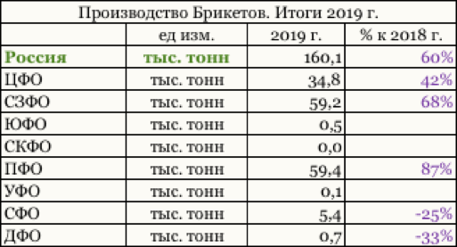 Производство топливных брикетов По итогам 2019 г. объемы российского выпуска топливных брикетов из отходов деревообработки выросли на 60%, составив 160 тыс. тонн. Таблица. Региональный выпуск топливных брикетов