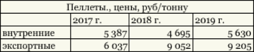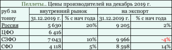 Гранулы топливные из отходов деревообработки («пеллеты»). Цены производителей по России (указаны среднестатистические цены по состоянию на декабрь 2019 г. и изменение цен за период с начала года в %). Цены реализации пеллет на внутреннем рынке с начала года выросли на 20%, составив на конец 2019 г. в среднем по России – 5630 руб. за тонну. Внешнеторговые цены на экспортные поставки пеллет в декабре 2019 г. соответствовали уровню 9205 руб. за тонну, с начала года экспортные цены увеличились на 2%.