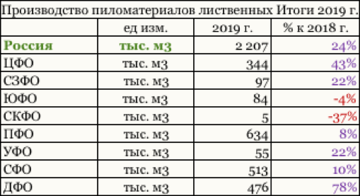 Производство лиственных пиломатериалов в России Лиственные пиломатериалы в настоящее время занимают 8% в совокупном объеме выпуска отечественных пиломатериалов. При этом темпы как по лесозаготовке лиственной древесины, так и по уровню производства пиломатериалов из древесины лиственных пород последние пять лет росли с опережением относительно лесозаготовки хвойной древесины и выпуска хвойных пиломатериалов. По итогам 2019 г. объемы выпуска лиственных пиломатериалов увеличились значительно, рост составил 24%. Объемы производства пиломатериалов из лиственной древесины в России в 2019 г. достигли уровня 2207 тыс. м3. В отчетном году максимально высокие объемы выпуска лиственных пиломатериалов зафиксированы в Приволжском ФО, доля составляет 29%. Показатели по выпуску лиственных пиломатериалов в ПФО выросли на 8%, составив 634 тыс. м3. На втором месте по объемам производства лиственных пиломатериалов находится Сибирский ФО с долей рынка 23%. Производители СФО за 2019 год выпустили 513 тыс. м3 лиственных пиломатериалов, что на 10% больше, чем год назад. Таблица. Региональный выпуск лиственных пиломатериалов, 2019 г.