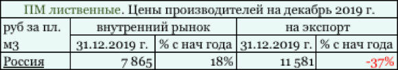 В декабре 2019 г. цены производителей лиственных пиломатериалов в целом по России составили 7865 руб за кубометр, за период с начала года зафиксирован рост цен на уровне 18%. По поставкам лиственных пиломатериалов внешним потребителям в 2019 году наблюдается заметное падение цен - за период с начала года экспортыные пиломатериалы лиственных пород древесины подешевели в среднем на 37%, составив в целом по России по состоянию на декабрь 2019 г. 11581 руб. за м3. Динамика цен производителей РФ на лиственные пиломатериалы