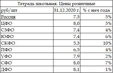 рост розничных цен на тетради в среднем на 4%. В Уральском ФО