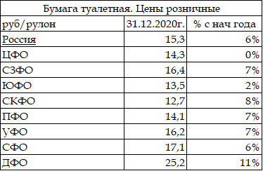 розничных цен на туалетную бумагу за период с начала 2020 г.