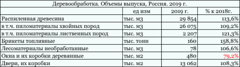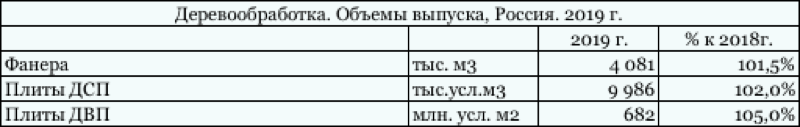Перспективными направлениями в деревообрабатывающей промышленности считаются производство древесных плит (МДФ, ДСП, ОСБ), выпуск фанеры и тарной упаковки. Основной тенденцией деревообработки в России является переориентация предприятий на производство более качественной продукции. В современных условиях состояние отечественной деревообрабатывающей отрасли также во многом зависит от экспорта. Поэтому наиболее успешными сегментами деревообрабатывающего комплекса были и остаются производства не только работающие на внутреннем рынке, но и имеющие сильный экспортный потенциал. Большинство сегментов российской лесной промышленности демонстрируют ощутимый рост в соответствии с мировыми тенденциями. Индекс производства по «обработке древесины и производству изделий из дерева и пробки, кроме мебели, производства изделий из соломки и материалов для плетения» в 2019 году составил 105,3% к уровню предыдущего года. Напомним, что в 2018 году по данному показателю был зафиксирован рекордно высокий уровень, который составил 110,6% к предыдущему году. Таблица. Производство продукции деревообработки в 2019 г., в целом по России