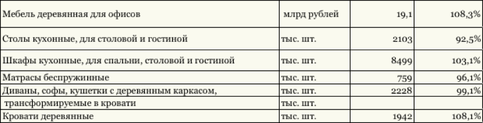 Наиболее высокий рост в отчетном году зафиксирован на рынке плит ДВП – за 2019 год объемы выпуска ДВП выросли на 5%, составив 682 млн. усл. м2 (годом ранее рост – 8,6%). Продолжает расти производство плит ДСП – в 2019 г. производственные показатели увеличились на 2%, составив 9986 тыс. усл. м3 (годом ранее рост – 16,5%). Умеренные темпы роста отмечены в производстве фанеры – показатели выросли за год на 1,5%, составив 4081 тыс. м3 (годом ранее рост – 7%). В настоящее время в перечне приоритетных инвестпроектов в области переработки леса находится 158 предприятий, в которые инвестировано более 450 млрд рублей. Размер лесосеки составляет около 80 млн кубических метров. Тем самым властям удалось создать и модернизировать мощности по глубокой переработке древесины. Увеличился экспорт фанеры, пиломатериалов, ДВП, ДСП, бумаги и топливных гранул. При этом вывоз леса-кругляка постепенно снижается. В настоящее время квота на вывоз необработанной древесины с Дальнего Востока за пределы России составляет 4 млн кубических метров. Минпромторг России выступил с предложением увеличить внутриквотную ставку таможенной пошлины на вывоз дальневосточных пород леса до 13%, сократить квоту на вывоз древесины до 2 млн кубов и поднять долю экспорта переработанной древесины с нынешних 40 до 60% общей стоимости в 2021 году. Производство мебели в 2019 г.