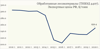 Внешнеторговые цены на обработанные лесоматериалы. Внешнеторговые цены на пиломатериалы из России последние три года остаются практически на одном уровне. На конец декабря 2020 г. среднестатистические цены отечественного экспорта распиленной древесины соответствовали уровню 250,4 $/тонну. Внешнеторговые цены на поставки распиленной древесины за период с начала года увеичились почти на 9%. Напомним, что в предыдущем году цены на российские экспортные пиломатериалы упали всего на 0,1%.