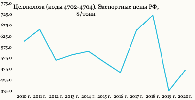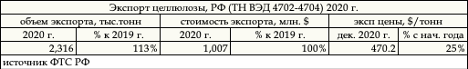 Валютная выручка от экспорта древесной целлюлозы по итогам 2020 г. Валютная выручка от реализации данной товарной группы упала на 0,5% по отношению к уровню предыдущего года. Всего за 2020 г. российские целлюлозно-бумажные предприятия реализовали древесную целлюлозу на мировом рынке на сумму 1007 млн. долл. Экспорт древесной целлюлозы входит в число важнейших экспортных товаров лесной отрасли России, занимая четвертую строчку в списке экспортных товаров, ранжированных по уровню валютной выручки, на долю валютной выручки от экспорта древесной целлюлозы приходится 8,1% совокупных доходов от экспорта ЛПК РФ за этот год. Таблица. Экспорт древесной целлюлозы из России. Итоги 2020 г.