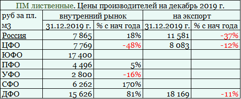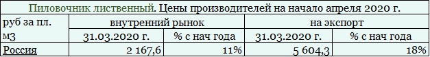 Средние цены производителей России на лиственные пиломатериалы для реализации на внутреннем рынке на начало апреля 2020 г. составили в среднем 8548 руб. за кубометр, за период с начала года зафиксирован рост цен на уровне девяти процентов. В 2019 г. лиственные пиломатериалы для внутреннего рынка в целом по стране подорожали на 18%.
