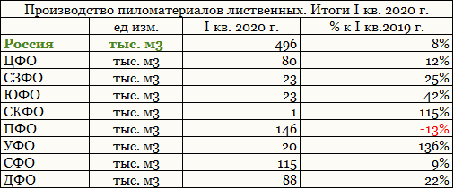 Таблица. Региональный выпуск лиственных пиломатериалов, 1 кв. 2020 г.