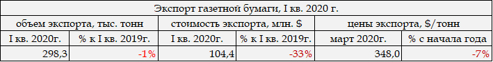 Экспортный рынок отечественной газетной бумаги за первые три месяца 2020 г. характеризовался небольшим снижением объемов поставок на фоне роста цены – газетная бумага за период с начала года год подорожала в среднем на 7%.