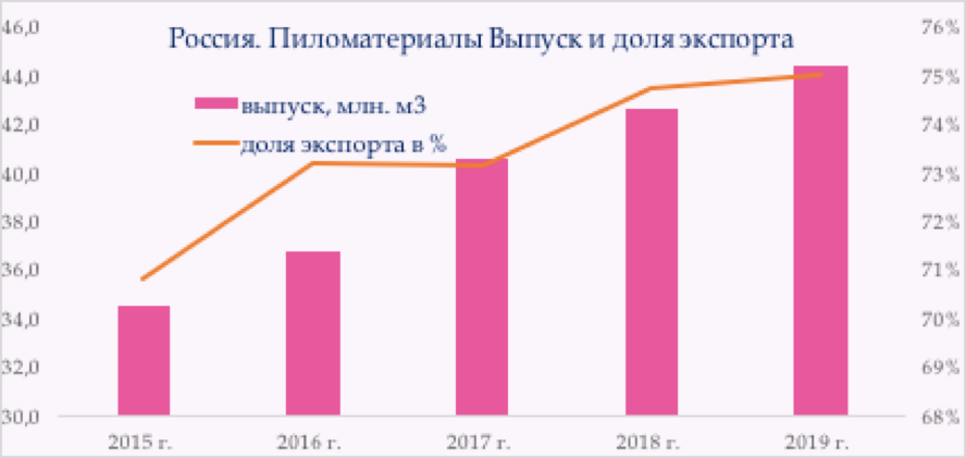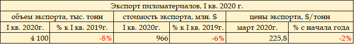 Производство пиломатериалов в России ориентировано в настоящее время в большей степени на экспорт. Россия является крупным игроком на экспортном рынке пиломатериалов, возглавляя с 2018 г. список ведущих поставщиков данной товарной группы. Ранее первую строчку среди мировых экспортеров распиленных лесоматериалов устойчиво занимала Канада. Экспортный рынок российских пиломатериалов за первые три месяца 2020 г. характеризовался небольшим снижением объемов поставок на фоне незначительного снижения цены – пиломатериалы за период с начала года год подешевели в среднем на 2%.