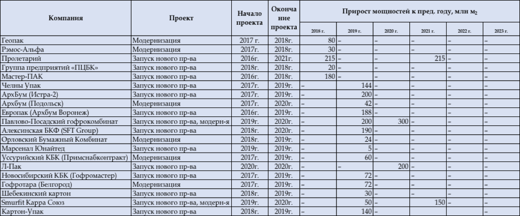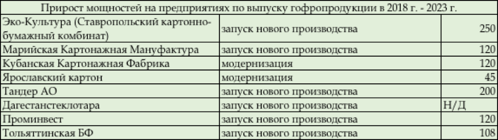 Таблица. Увеличение производственных мощностей за счет модернизации и ввода в строй новых новых производственных мощностей на российском рынке гофропродукции за период с 2018 г по 2023 г.