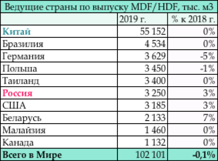 В число стран с наибольшими объемами выпуска плит MDF/HDF в 2019 г. вошли такие страны, как Бразилия, Германия, Польша, Таиланд, Россия, США, Беларусь, Малайзия, Канада и Франция. Сравнительно высокие объемы выпуска плит MDF/HDF зафиксированы также в таких странах, как Чили, Новая Зеландия, Румыния, Япония и др. Таблица. Глобальное производство MDF/HDF, итоги 2019 г.
