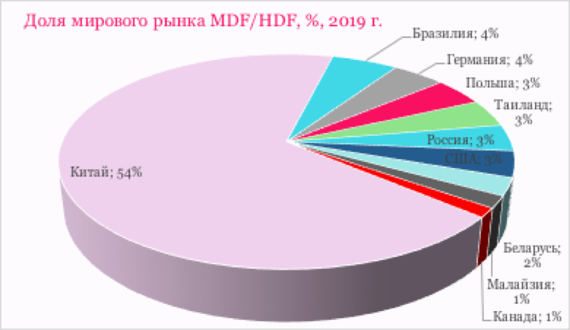 Анализ мирового рынка MDF/HDF подготовлен на основании статистических данных, опубликованных ФАО ООН за 2019 г. Производство плит MDF/HDF является разновидностью древесно-волокнистых плит, в мировом масштабе на данную продукцию приходится свыше 90% в совокупном объеме выпуска ДВП. Значительная часть потребляемой ДВП (MDF/HDF) используется в производстве мебели. Плиты ДВП (MDF/HDF) также широко применяются в строительстве и вагоностроении. Ключевые мировые компании-производители плит MDF: Kronospan, Egger (обе – Австрия), Greehigh (Индия), Yonglin Group, Sunway Forest Products, Yunfu Zhenying Wood Co., Ltd., Guangxi Fenglin Wood Industry Group, Guangzhou Huafangzhou Wood Co., Ltd (все – Китай). Рынок плит MDF напрямую зависит от развития мирового строительного сектора, в частности, рынка строительных материалов, а также развития мебельной отрасли. С географической точки зрения выделяется крупный потребитель MDF: Азиатско-тихоокеанский регион (АТР). В АТР ключевым бенефициаром расширения рынка MDF выступает КНР.