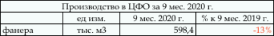 Производство фанеры в ЦФО: В Центральном ФО в настоящее время выпускают 20% отечественного производства фанеры. Производство фанеры в ЦФО падает последние два года. За период с января по сентябрь 2020 г. объемы выпуска фанеры в ЦФО составили 598,4 тыс. м3. В производстве фанеры в ЦФО за 9 мес. 2020 г. в сравнении с таким же периодом предыдущего года зафиксирован спад на уровне 13%. Напомним, что в 2019 г. в ЦФО показатели по выпуску фанеры упали на 4%, в 2018 г. производство фанеры в ЦФО выросло на 5%. Таблица. Производство фанеры в ЦФО по итогам 9 мес. 2020 г.