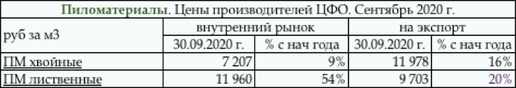 См. Инфографика Производство лиственных пиломатериалов в ЦФО: По совокупным объемам производства лиственных пиломатериалов ЦФО занимает четвертое место. Производство лиственных ПМ в ЦФО последнее время росло высокими темпами. Так в 2019 г. объемы выпуска данной продукции увеличились на 43%. В 2020 г. производство лиственных ПМ в регионе демонстрирует отрицательную динамику - по итогам 9 мес. 2020 г. спад производства составил 31% г/г. Всего в ЦФО за истекший период было выпущено около 174 тыс. кубометров пиломатериалов из лиственных пород древесины. Цены предприятий ЦФО на пиломатериалы: Реализация пиломатериалов хвойных пород лесопильными предприятиями ЦФО на внутреннем рынке на конец сентября 2020 г. осуществлялась в среднем по цене 7207 руб. за пл. кубометр. За девять месяцев 2020 г. цены на ПМ хвойных пород древесины в этом регионе увеличились на 9%. Напомним, что в 2019 г. хвойные ПМ для реализации на внутреннем рынке ЦФО упали на 4%. Экспортные цены на хвойные ПМ в целом по ЦФО по состоянию на конец сентября 2020 г. составили 11960 руб. за м3. За девять месяцев 2020 г. экспортные ПМ хвойных пород подорожали на 16%. Напомним, что в 2019 г. экспортные ПМ из ЦФО подешевели на 12%. Таблица. Цены производителей ЦФО на ПМ. Внутренний рынок и экспорт; на начало окт. 2020 г.
