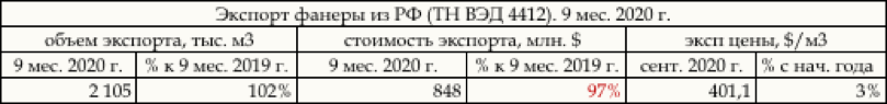 9-ти мес. 2020 г. российский экспорт фанеры в натуральном