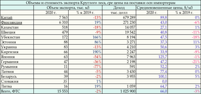 Таблица. Объемы экспорта и средневзвешенные экспортные цены на поставки круглого леса из России основным импортерам. 2020 г.