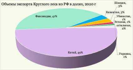 Ведущие импортеры круглого леса из России по итогам 2020 г.: Китай, Финляндия, Казахстан и Швеция. Экспорт круглого леса в Китай в отчетном году в натуральном выражении сократился на 13% относительно уровня предыдущего года. Вторым значимым импортером российской необработанной древесины является Финляндия. Поставки необработанной древесины в Суоми по итогам 2020 г. выросли на 19%. Третьим в списке ведущих импортеров по объемам экспорта круглого леса выступает Казахстан, уровень поставок в эту страну по итогам 2020 г. снижен на 18%. Экспорт круглого леса в количественном измерении в Швецию за 2020 г. упал на 6%. В список импортеров российского круглого леса по последним данным входят свыше 15 стран. Ведущие импортеры российского круглого леса – Китай и Финляндия. В 2020 г. на рынки Поднебесной из России было направлено почти половина всех грузопотоков круглого леса (доля поставок составила 49% от совокупного объема экспорта данной товарной группы). Поставки круглого леса в Финляндию заняли нишу 41%. В Казахстан было отгружено 3% всех поставок круглого леса. Доля поставок круглого леса в Швецию в 2020 г. составила не более трех процентв. В Японию в прошлом году было отправлено на 54% меньше необработанных лесоматериалов. В число импортеров российского круглого леса по итогам 2020 г. входят также такие страны, как Узбекистан, Эстония, Украина и Киргизия, а также Япония, Германи, Румыния и Латвия. Поставки круглого леса из России осуществляются также в такие страны, как Беларусь, Словакия, Литва и другие страны Диаграмма: Долевое распределение объемов экспорта круглого леса по ведущим странам-импортерам