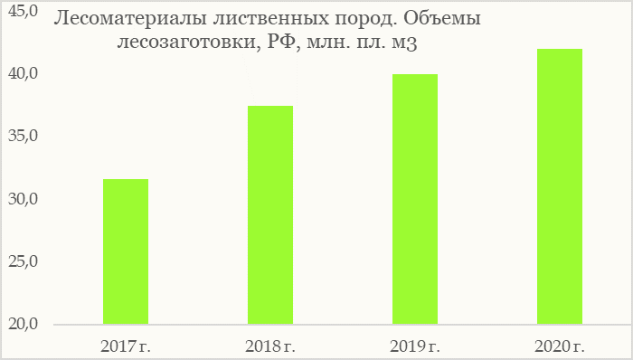 Лесозаготовка лиственных лесоматериалов в Росси по итогам 2020 г.: на вывозку круглых лесоматериалов лиственных пород древесины в настоящее время приходится более трети совокупного объема лесозаготовительных работ по вывозке древесины в масштабах страны. В соответствии с информацией Росстата в целом по стране в 2020 г. объем вывозки круглых лесоматериалов из березы и осины вырос до 42 млн. пл. кубометров, объемы лесозаготовки за год увеличились на 1,5%. Заметим, что объемы лесозаготовительных работ по вывозке лесоматериалов лиственных пород древесины растут восьмой год подряд. Напомним, что в 2019 г. рост выпуска лиственных лесоматериалов достиг 6,7%. Вывозка балансовой древесины занимает наиболее высокую долю в структуре заготовки лиственных лесоматериалов России, доля достигает 37%. Лидером по вывозке лиственных балансов выступает СЗФО. Четверть объема лесозаготовительных работ лиственной древесины составляет вывозка пиловочного сырья - по объемам заготовки лиственного пиловочника лидирует СЗФО, также высокие объемы заготовки зафиксированы в Сибирском и Дальневосточном федеральных округах. На лиственные лесоматериалы круглые для лущения (фанкряжа) приходится до 10%. По товарной позиции "Лесоматериалы необработанные, окрашенные, протравленные, обработанные кроезотом или другими консервантами" в 2020 г. зафиксирован рост производства на уровне 25% до 131 тыс. м3. В 2019 г. объемы выпуска необработанных лесоматериалов выросли на 6,6%, в 2018 г. спад – 6,5%.