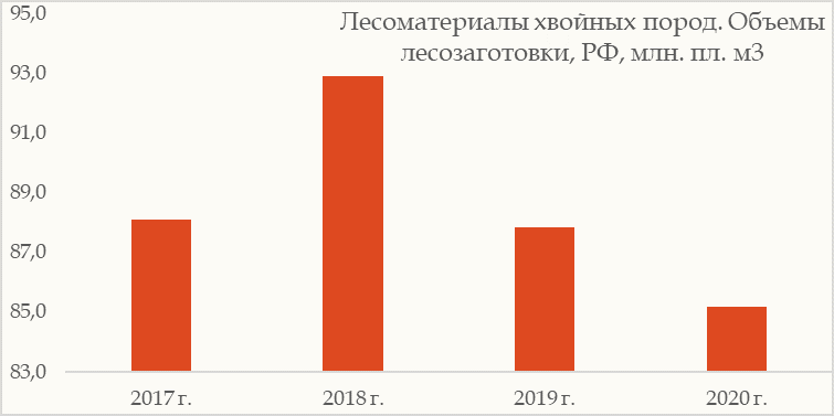 Лесозаготовка хвойных лесоматериалов в России по итогам 2020 г.: заготовка хвойной деловой древесины (сосна, ель, лиственница, кедр) в структуре лесозаготовки России в 2020 г. составляет 67% от совокупного объема вывозки круглого леса. В соответствии с информацией Росстата объем лесозаготовительных работ по заготовке и вывозке хвойной древесины промышленного назначения по итогам 2020 г. в целом по стране составил 85,2 млн. пл. кубометров, что на 3,3% меньше, чем год назад. Уровень лесозаготовительных работ по вывозке необработанной древесины хвойных пород падает второй год подряд. Напомним, что в 2019 г. объемы вывозки хвойной древесины упали почти на 5,5%, в 2018 г. по уровню лесозаготовительных работ хвойной деловой древесины зафиксирован рост 5,4%. Основу лесозаготовки хвойных лесоматериалов (сосна, ель, лиственница) составляет вывозка пиловочника, доля составляет 66%. Наиболее высокие объемы вывозки хвойного пиловочника зафиксированы в Сибирском ФО. На втором месте по вывозке пиловочного сырья стоит СЗФО. Третье место занимает ДФО. Хвойные балансы в совокупном объеме вывозки хвойных лесоматериалов в целом по стране занимают долю 16%. На хлысты приходится 12%. Круглые хвойные лесоматериалы в совокупном объеме лесозаготовительных работ хвойных лесоматериалов достигают 4%. Хвойный фанкряж по объемам вывозки не превышает одного процента. Диаграмма. Динамика объемов вывозки лиственных лесоматериалов