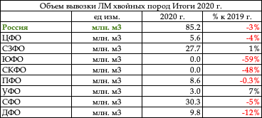 Таблица. Объемы вывозки круглых лесоматериалов хвойных пород, 2020 г.