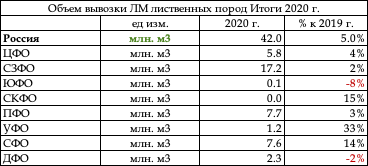 Таблица. Объемы вывозки лесоматериалов лиственных пород, 2020 г.