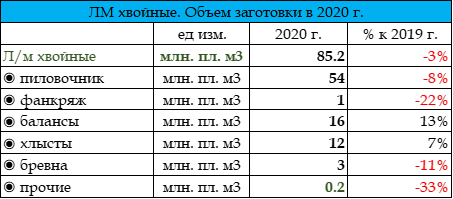 Основу лесозаготовки хвойных лесоматериалов составляет вывозка пиловочника, в 2020 г. объемы заготовки хвойного пиловочника в целом по стране составили 53,6 млн. пл м3, что на 8% меньше, чем год назад. Наиболее высокие объемы вывозки хвойного пиловочника зафиксированы в Сибирском ФО, доля - 36%, объем вывозки хвойного пиловочника в СФО в 2020 г. составили 19 млн. пл. м3, что на 12% меньше, чем в предыдущем году. На втором месте по уровню вывозки пиловочного сырья стоит СЗФО, доля - 33%, объем заготовки хвойного пиловочника в СЗФО превысил 18 млн. пл. м3, что на 2% меньше, нежели год назад. Третье место с долей 13% занимает ДФО, в этом регионе в 2020 г. было заготовлено 7,2 млн. пл. кубометров хвойного пиловочника, что на 12% меньше, чем год назад. Хвойные балансы в совокупном объеме вывозки хвойных лесоматериалов в целом по стране занимают долю 19%, в 2020 г. уровень вывозки балансовой древесины хвойных пород в целом по стране вырос на 13% и составил 15,8 млн. пл. м3. Наиболее высокие показатели по объемам ввозки хвойного пиловочника зафиксированы в СЗФО, доля рынка 47%, в 2020 г. объемы заготовки балансовой древесины хвойных пород в этом регионе выросли на 9% до 7 млн. пл. м3. Существенно выросли за год объемы вывозки хвойных балансов в ДФО - всего за год в этом регионе было заготовлено 0,9 млн.пл. м3 балансовой древесины, что на в полтора раза больше, чем год назад. По Сибирскому ФО показатели по вывозке хвойных балансов выросли на 19%, составиви 3,6 млн. пл. м3. На хлысты приходится 12%, объемы вывозки достигли уровня 12 пл. м3, что на 7% больше, чем год назад. Круглых лесоматериалов из хвойной древесины в 2020 г. в целом по стране было заготовлено около 3 млн. пл. м3, что на 11% меньше, чем в предыдущем году. Хвойный фанкряж по объемам вывозки в целом по стране не превышает 0,6 млн. пл. м3, за отчетный год уровень вывозки фанкряжа упал на 22%. См. ИНФО Л/М хвойные - структура заготовительных работ https://www.lesonline.ru/news/?cat_id=25&n=401743