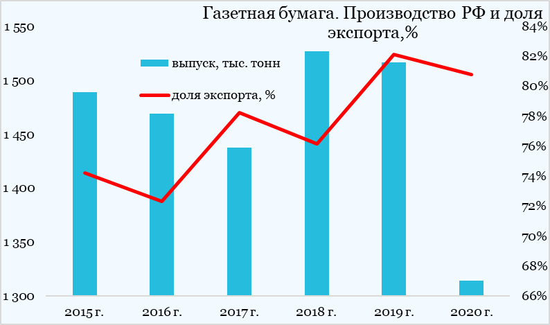 Динамику объемов выпуска газетной бумаги в России см. Инфографика https://www.lesonline.ru/news/?cat_id=25&n=377108 Цены производителей на газетную бумагу см https://www.lesonline.ru/news/?cat_id=25&n=399655 Сегодня в России производством и экспортом газетной бумаги занято четыре старейших предприятия. Это предприятия Приволжского ФО: «Волга» (Нижегородская область, г. Балахна) и «Соликамскбумпром» (г. Соликамск, Пермский край). Предприятия по выпуску газетной бумаги, расположенные в Северо-Западном ФО: «Монди СЛПК (Сыктывкар, Республика Коми) и «Кондопога» (Республика Карелия). Характеризуя динамику производства газетной бумаги в России, напомним, что за период с 2016 г. по 2017 г. производство газетной бумаги в России не претерпело существенных изменений, а 2018 г. был зафиксирован рост по объемам выпуска на уровне 6-ти процентов, в 2019 г. производственные показатели в целом по стране упали на 0,7%. Диаграмма. Производство газетной бумаги в РФ и кривая «доля экспорта»