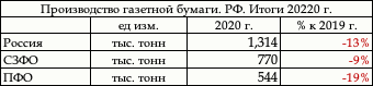 Россия издавна выпускает газетную бумагу – история бумажного производства насчитывает почти сто лет. Производство газетной бумаги в России налажено только в двух регионах – в Северо-Западном ФО и в Приволжском ФО. По итогам 2020 г. в соответствии с информацией Росстат выпуск газетной бумаги в России упал на 13% относительно аналогичного показателя предыдущего года, составив 1314 тыс. тонн. Напомним, что в 2019 г. производство газетной бумаги упало на 1%. Приволжский ФО по последним данным занимает долю 41% в совокупном выпуске данной продукции в стране. За 202о г. в Приволжском ФО объем выпуска газетной бумаги составил 544 тыс. тонн, что на 19% меньшн, нежели год назад. Напомним, что в 2019 г. выпуск газетной бумаги по ПФО упал на 3%. Доля Северо-Западного ФО в российском производстве газетной бумаги составляет 59%. По итогам 2020 г. в СЗФО зафиксирован спад объемов производства газетной бумаги в сравнении с уровнем предыдущего года - производство газетной бумаги упало на 9%. Всего за 2020 г. производство газетной бумаги в СЗФО составило 770 тыс. тонн. Напомним, что в 2019 г. объемы выпуска газетной бумаги в СЗФО выросли на 1%. Таблица. Производство газетной бумаги в России