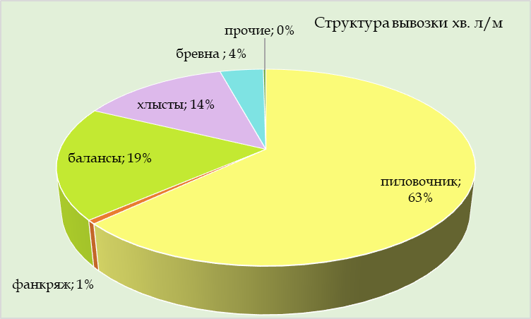 По итогам 9 мес. 2021 г. в сравнении с аналогичным периодом предыдущего года отмечен небельшой рост по заготовке хвойной деловой древесины (сосна, ель, лиственница, кедр), минус 1%, всего за девять месяцев 2021 г. объем лесозаготовительных работ по вывозке хвойных лесоматериалов в целом по стране составил 63,3 млн. пл. кубометров. Напомним, что в 2020 г. объем лесозаготовительных работ по заготовке и вывозке хвойной древесины промышленного назначения упал на 3,3%, в 2019 г. объемы вывозки хвойной древесины упали на 5,5%, в 2018 г. зафиксирован рост 5,4%. Диаграмма Структура лесозаготовительных работ по вывозке хвойных лесоматериалов