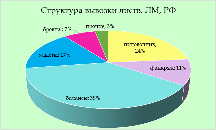 Объемы лесозаготовительных работ, направленных на вывозку древесины лиственных пород по итогам 9 мес. 2021 г. выросли на 6,9% относительно аналогичного уровня предыдущего года, составив 31 млн. пл. м3. Напомним, что в 2020 г. объем вывозки круглых лесоматериалов из березы и осины увеличился на 1,5%, в 2019 г. рост составил 7%. Заметим, что объемы лесозаготовительных работ по вывозке лесоматериалов лиственных пород древесины растут восьмой год подряд. Диаграмма. Структура лесозаготовительных работ по вывозке лиственных лесоматериалов