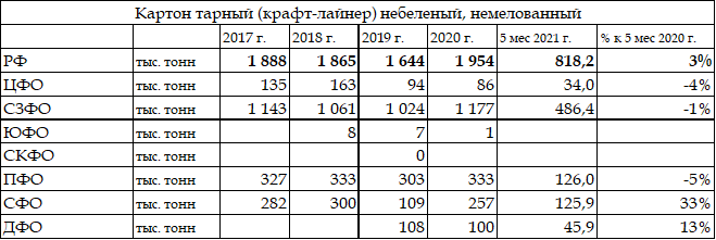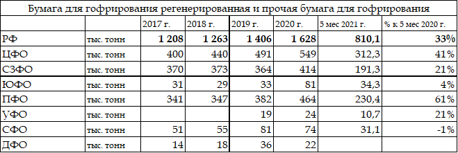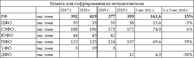 Таблица. Производство бумаги для гофрирования из полуцеллюлозы Россия и федеральные округа