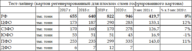 Ведущие производители топ-тестлайнера:– Knauf,– Nicol-Pak,– В конце 2020 г. возобновлено производства топ-лайнера с белым верхом в Выборге. Производство гофробумаги Бумага для гофрирования (флютинг) – бумага для изготовления среднего (волнистого) слоя при производстве гофрокартона. Гофрированный слой служит для поддержания определенного расстояния между поверхностными картонами, обеспечивая сохранность изделия при статистических и динамических нагрузках (при складировании, штабелировании, хранении и т.д.). Сырье для производства – химическая лиственная полуцеллюлоза или макулатура (ОСС2 /смешанная). В производстве гофрированной бумаги предыдущие два гоода наблюдалась тенденция роста выпуска гофробумаги из макулатурного сырья на фоне снижения производства гофробумаги из полуцеллюлозы. По итогам 5-ти мес. 2021 г. в сравнении с таким же периодом предыдущего года выпуск гофробумаги регенерированной увеличился на 33%, производство гофробумаги из полуцеллюлозы выросло на 15%. Доля производства гофробумаги из макулатуры составляет 83% в совокупном выпуске гофробумаги в целом по стране. Таблица. Производство бумаги для гофрирования регенерированной, Россия и федеральные округа