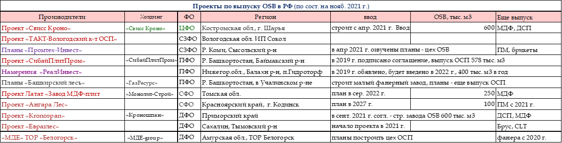 Проекты и планы на рынке плит OSB в России - 2021 г.